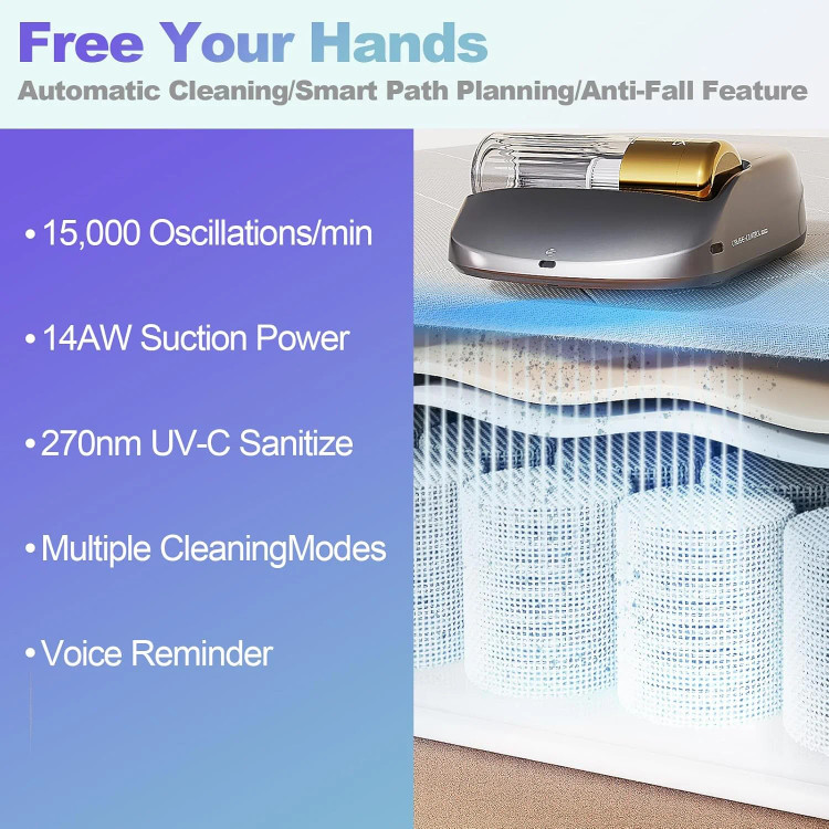Advanced Automatic Bed Vacuum Cleaner - UV-C Disinfectant with Ultraviolet Light, Cordless and Rechargeable with 14KPa Suction Power, Eliminates Dust Mites, Allergens, with HEPA Filtration