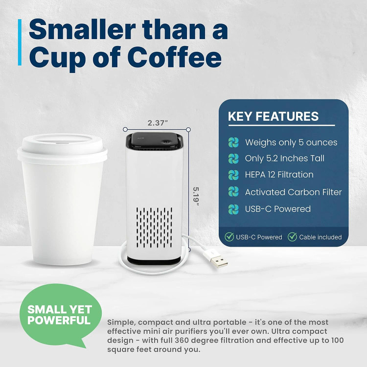 KIKI PURE Mini Air Purifier with HEPA Filter and USB-C Power for Allergies, Dust and Smoke, Ultra-Quiet 18dB Filtration of Airborne Particles, Bacteria and Viruses (White)